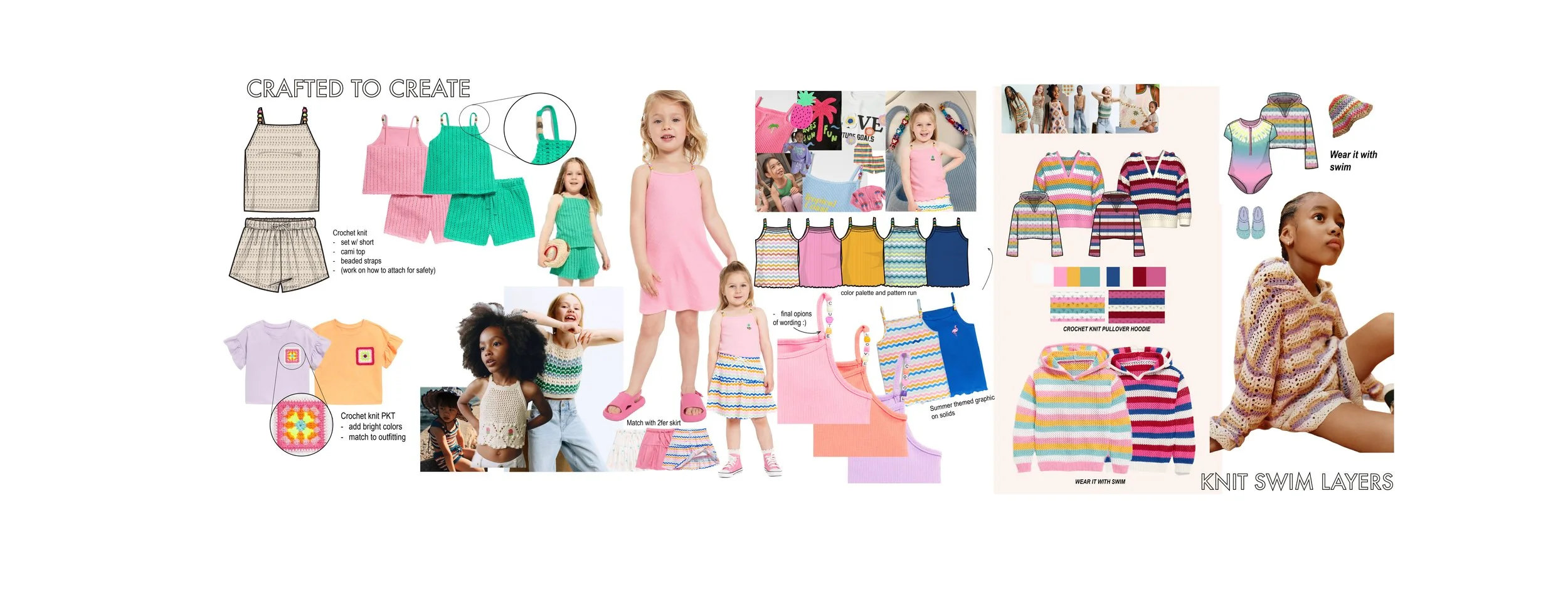 For Su24, A playful collection for toddler girls featuring a mix of cozy knits and breezy wovens. Soft knit tops in fun patterns like stripes and florals are paired with breathable woven shorts or skirts for a laid-back, stylish look. The collection also includes adorable matching sets with ruffled hems and cute graphic prints that make dressing a breeze. For water play, there are swimwear options in vibrant colors and playful patterns, including one-piece swimsuits and tankini sets with sweet details like bows and frills. These outfits are designed for comfort, cuteness, and all-day play under the summer sun!